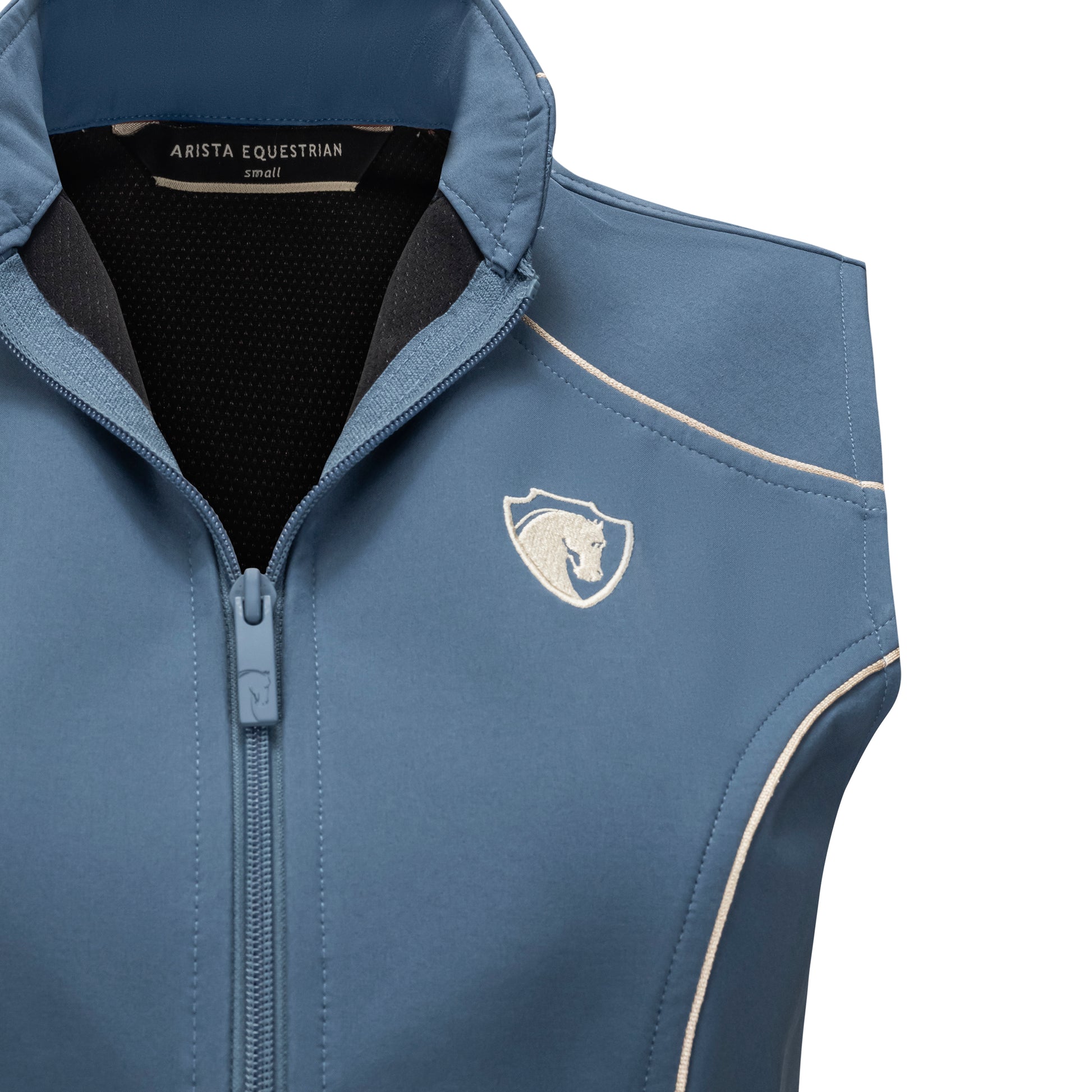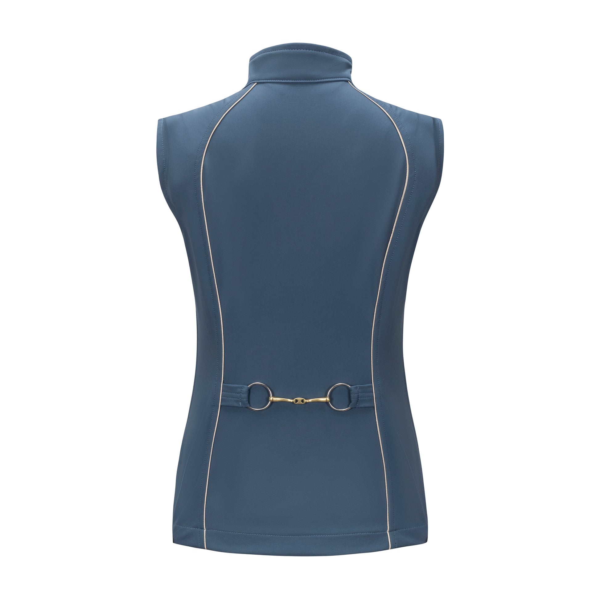 The Iconic Bit Vest in Slate with Oatmeal Piping is a graceful fusion of timeless equestrian charm and modern elegance. Its sculpted silhouette, traced with delicate contrast piping, gently follows the contours of the body, offering a flattering embrace without restraint. Crafted from whisper-light, breathable fabric with just the right amount of stretch, it moves effortlessly with you—whether you're riding through morning mist or walking beneath golden autumn trees. The signature bit detail at the back adds a subtle, romantic nod to the sport’s heritage, while the high collar and slender zipper lend a refined finish. With its thoughtful tailoring and quiet sophistication, this vest is as much a feeling as it is a garment.